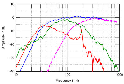 Fig.2 Burmester B99, nearfield responses of midrange unit (magenta), woofers (green), port (red), and their complex sum (blue), plotted below 800Hz, 1kHz, 400Hz, and 800Hz, respectively.
