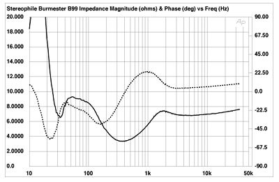 Once the cables were hooked up, I estimated the B99's voltage sensitivity as 89.5dB(B)/2.83V/m, which is within experimental error of the specified 90dB. This is a useful 3dB above average. The plot of the speaker's impedance magnitude and phase against frequency (fig.1) reveals the B99 to be moderately difficult for an amplifier to drive, due to a drop to 3.33 ohms in the midrange. However, the electrical phase angle is generally low, meaning that a good amplifier rated at 4 ohms will have no difficulty coping with the speaker.