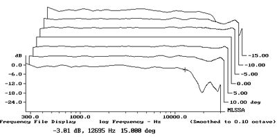 Fig.4 Burmester B99, lateral response family at 50", from back to front: differences in response 15 degrees-5 degrees off-axis, reference response on tweeter axis, differences in response 5 degrees-15 degrees off-axis.